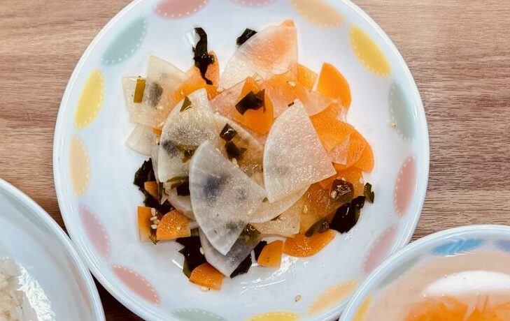 大根、にんじんはいちょう切りにする。 わかめは水で戻して細かく刻む。