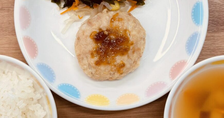 鶏ひき肉に1、、パン粉、ぬるま湯で溶いたスキムミルク、食塩を加えて粘りが出るまで練る。