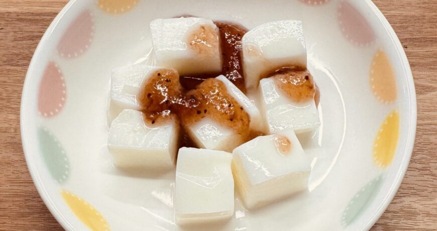 粉寒天と水を鍋に入れて火にかけ煮溶かし、1~2分沸騰させる。さらに上白糖を加えてよく混ぜる