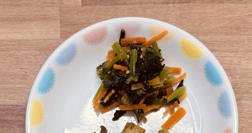 1. こまつなは2cm幅に切る。にんじんは短い細切りにする。