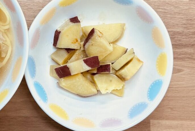 1. さつまいもは皮をまだらに剥いて、半月またはいちょう切りにする。