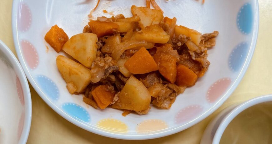フライパンに油を熱し、にんじんとたまねぎをよく炒める。しんなりしたら豚小間を加えて炒め、色が変わったらじゃがいもを加えて炒める。