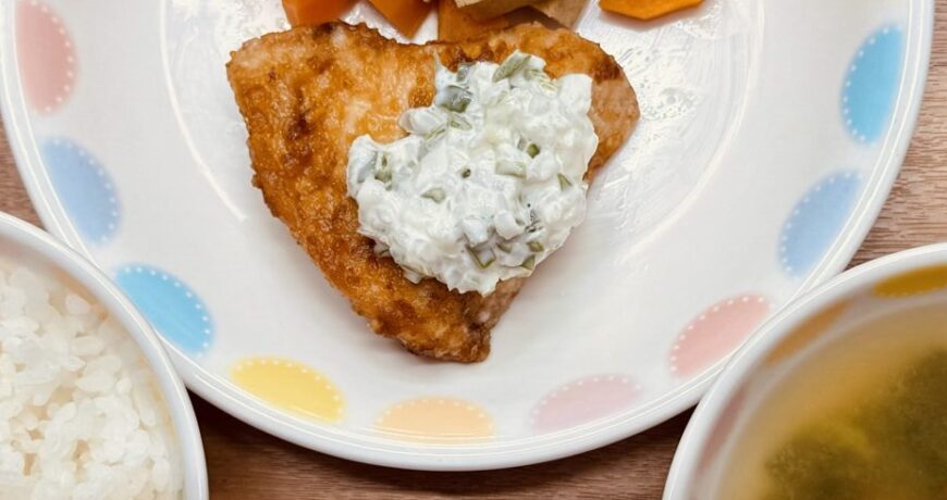 たまねぎ、ピーマンはみじん切りにして、茹でて冷まし水気を切る。マヨドレと合わせてタルタルソースを作る。