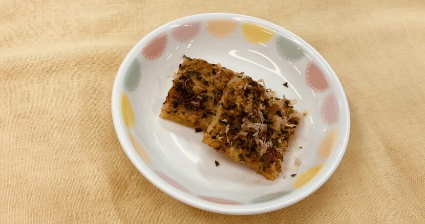 焼きあがったら中濃ソース、かつお削り節、青のりをかける。