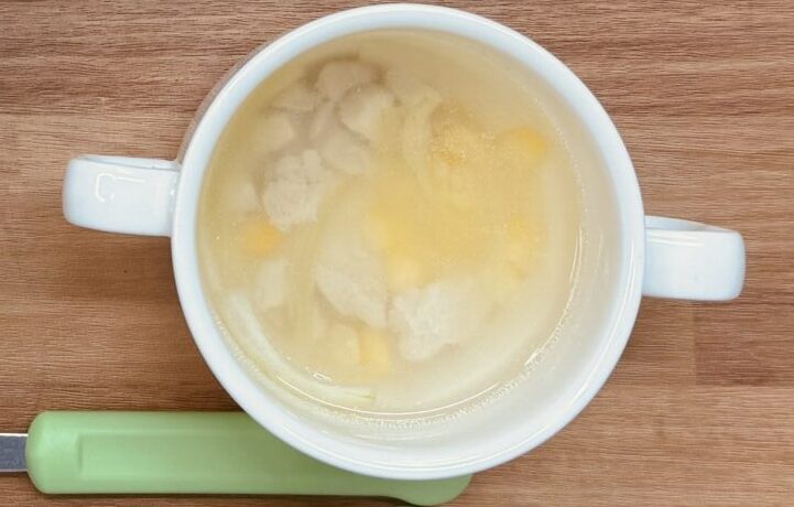 2. 鍋に水、コンソメを入れて煮立てる。鶏むね肉、1、コーンを加えてさらに煮る。