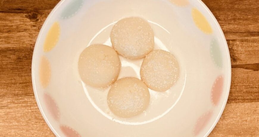 粗熱が取れたら、フードプロセッサーで細かく砕いた上白糖をまぶす。