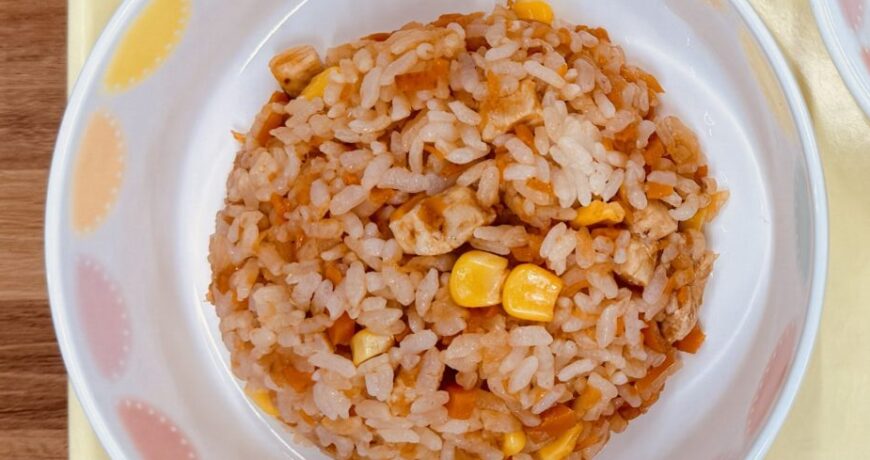 鍋に油をひき、たまねぎとにんじんをよく炒め、鶏むね肉、コーンを加えて更に炒める。
