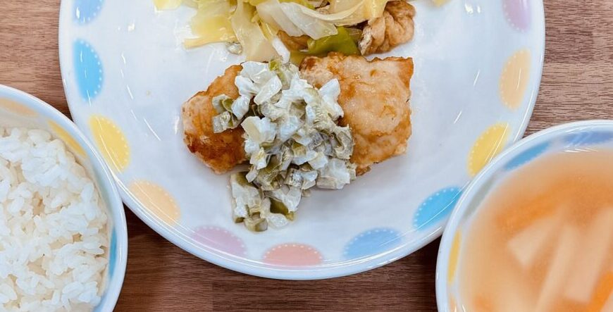 たまねぎ、ピーマンはみじん切りにして茹で、流水にさらして水気を絞る。マヨドレとあわせてタルタルソースを作る