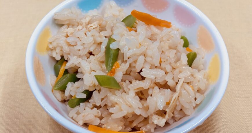 米、だし、料理酒、しょうゆを入れて通常通りの水分量にし、油揚げ、にんじんを加えて混ぜ、炊飯する。