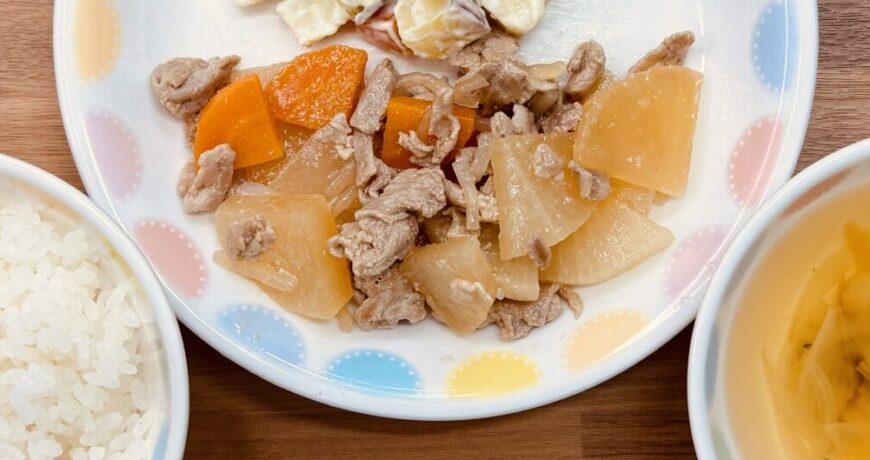 1. 豚小間は1~2cm幅、大根、にんじんは厚めのいちょう切り、しらたきは2cm幅に切る。