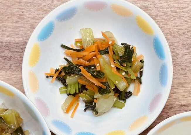 チンゲンサイは2cm幅に切り、茹でて流水にさらして水気を絞る。